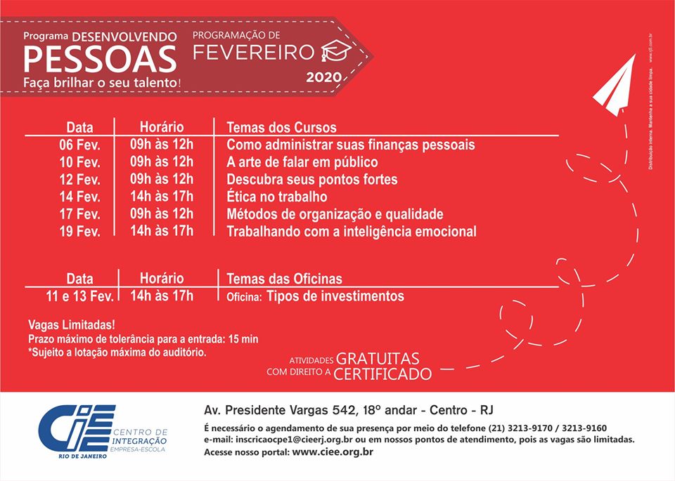 O Programa Desenvolvendo Pessoas em Parceria do CIEE Rio, oferece cursos gratuitos para o mês de fevereiro.